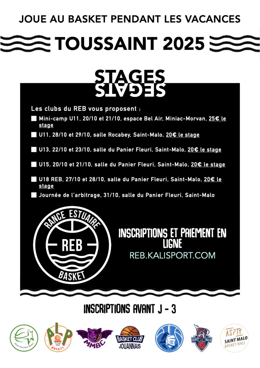 Le REB (Rance Estuaire Basket), vous propose ses traditionnels stages (mixtes) durant les vacances de la Toussaint du lundi 20 octobre au vendredi 31 octobre.